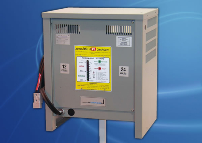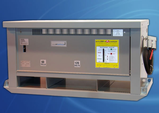 Chargers for lift and pallet trucks, shelf loaders, sweepers, personnel carriers, in-plant ambulances and fire trucks are available in 6 to 40 cell units and 100 to 2,000 AH capacities.